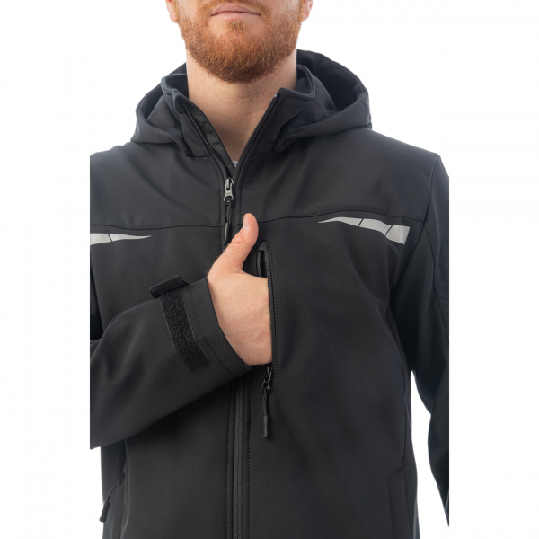 Капюшон куртки глубокий, регулируется по овалу лица, за ненадобностью его можно отстегнуть. Манжеты рукавов регулируются по объёму с помощью хлястиков на липучках. Во избежание быстрого истирания область локтей усилена прочной тканью. В куртке предусмотрены функциональные карманы. Все внешние карманы на молнии, в том числе нагрудный карман для важных документов и карман на рукаве. На груди и спине размещены светоотражающие элементы, которые выделят фигуру в тёмное время суток.