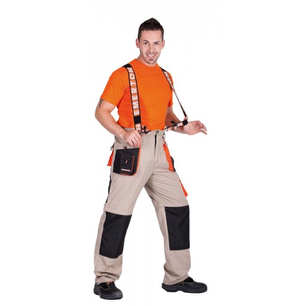 Рабочие брюки Cerva Эмертон (Emerton), 4 в 1 отличное решение для летнего сезона. Модель отличается возможностью трансформироваться в рабочий полукомбинезон, рабочие брюки, рабочие шорты на лямках и рабочие шорты. Рабочие брюки Cerva Эмертон (Emerton) предназначены для летнего сезона, так как ткань брюк состоит на 100% из хлопка. Так же брюки усилены черными вставками из более плотной ткани. Эластичные лямки позволяют настроить рабочие брюки по росту. На коленях находятся специальные секции под наколенники. Данные рабочие брюки Cerva снабжается европейским сертификатом безопасности EN 340 (Одежда специальная защитная).
