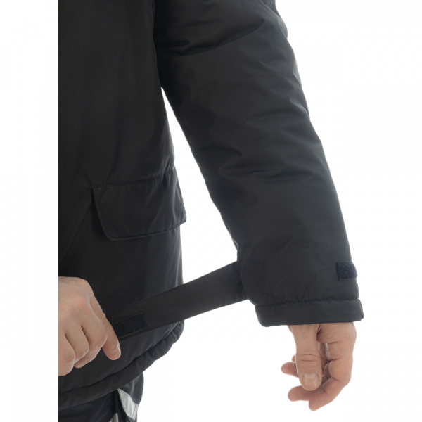 Куртка застёгивается сверху и снизу на тракторную молнию с двойной ветрозащитной планкой на липучках и кнопках. Рукав с регулировкой на застёжке-липучке и теплыми манжетами не позволят пробраться холоду внутрь. В талии куртка утягивается эластичным шнуром с фиксатором, что также помогает сохранению тепла.